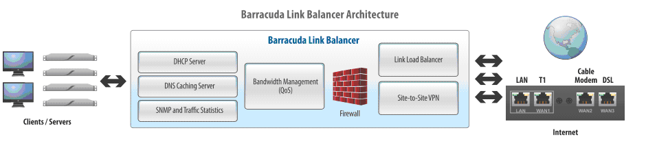 Barracuda LinkBalancer je navržen tak, aby optimalizoval využívání několika internetových připojení (T1, T3, DSL, kabel). Spojením těchto připojení od více internetových poskytovatelů a automatickým failover je dosaženo vyšší spolehlivosti internetu.Barracuda Link Balancernabízí možnost správy šířky pásma a kvality služeb (QoS) a dokáže poskytnout větší šířku pásma pro kritické aplikace.