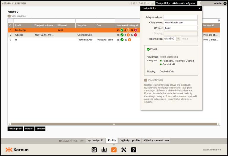 Výchozí profil: nastavení bezpečnostních pravidel dle tematických kategorií.
