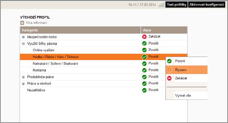 BYPASS – omezený přístup například pro kategorie: sociální sítě, počítačové hry, nakupování, hudba-rádio-kino-televize, cestování-dovolená, bankovnictví, mobilní telefony-operátoři, vojenství-zbraně, chat-blogy-fóra…