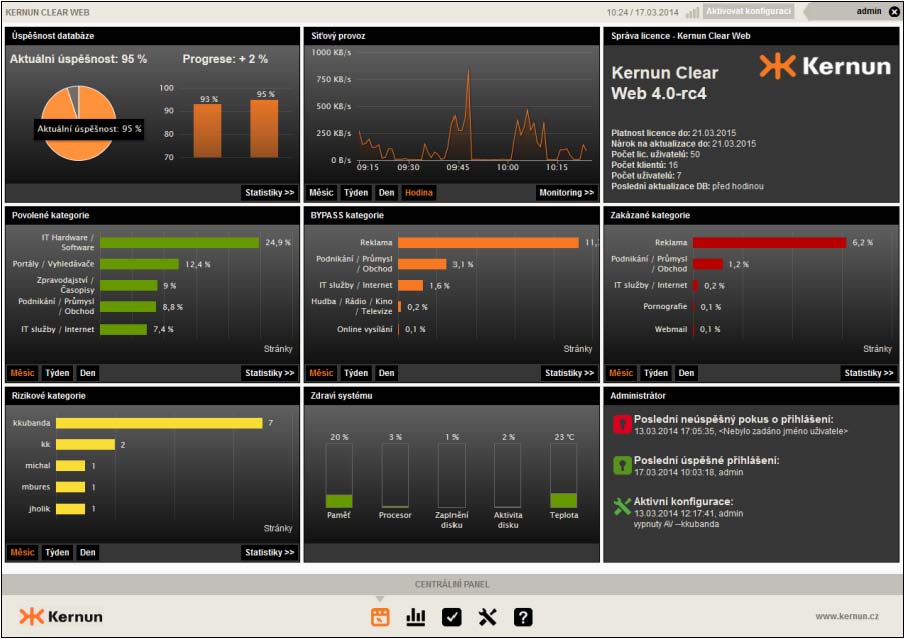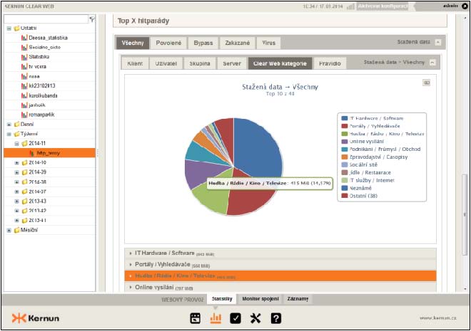 Webový filtr Kernun Clear Web Edu disponuje databází webových stránek, které jsou tematicky rozděleny do 60 kategorií například: vzdělávání, zpravodajství, sport, státní správa, sociální sítě, nakupování, počítačové hry, nahota, pornografie, násilí, pirátské weby… sami rozhodnete a nastavíte, které kategorie budou vašim uživatelům zpřístupněny a za jakých podmínek.